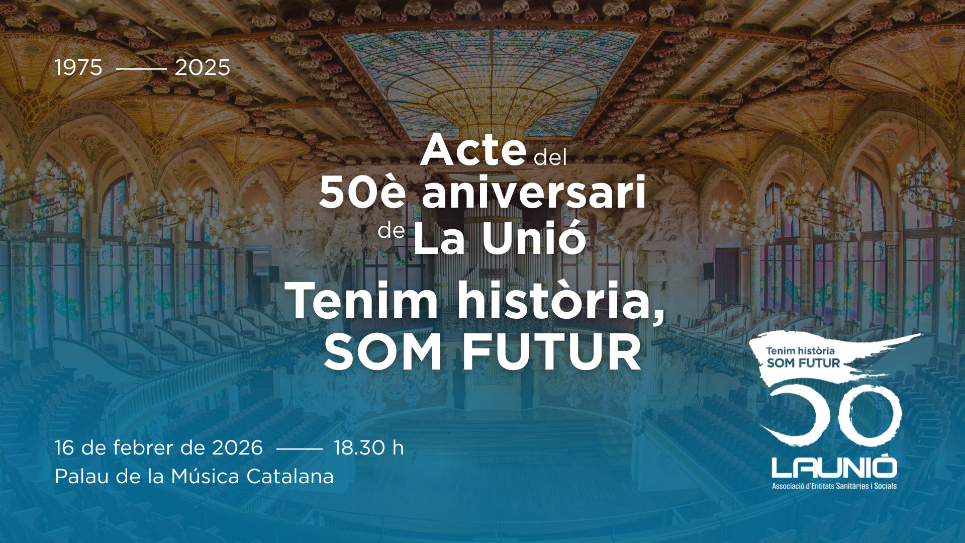 La Unió celebra l’acte commemoratiu del 50è aniversari, sota el lema “Tenim Història, som Futur”, el dia 16 de febrer de 2026, a les 18.30 hores (obertura de portes a les 17.30 hores), al Palau de la Música Catalana (C/ Palau de la Música, 4-6, Ciutat Vella, 08003 Barcelona).